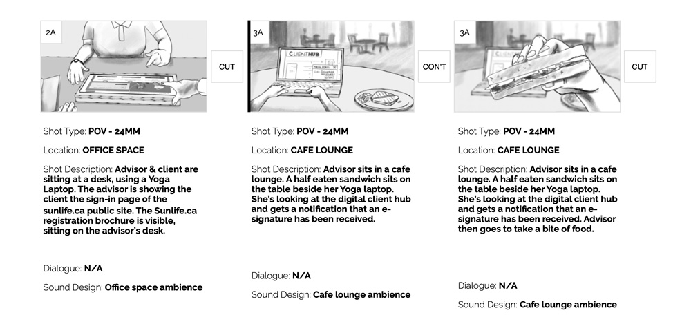 This campaign pushed creative and technical boundaries. We scripted two distinct narratives designed to mirror the real-world experience of using Sun Life’s digital tool. One from the client’s POV, and one from the advisor’s. Our director, Brandon, storyboarded each sequence in detail to help internal teams visualize the execution.